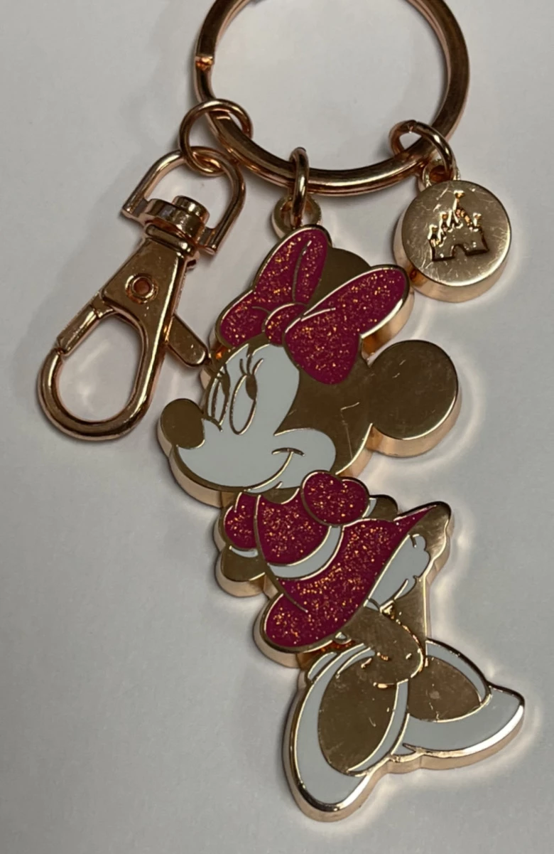 Bring along Minnie Mouse on your travels with this durable Keychain. Features Minnie Standing with her sparkly dress, in a Rose Gold Color.Β